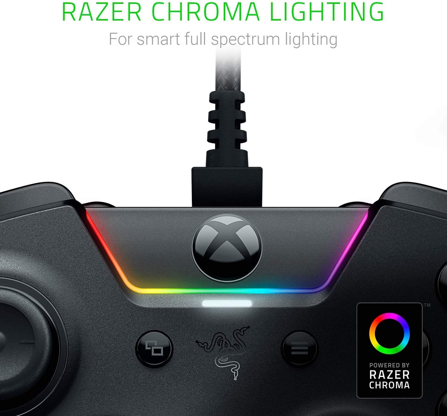 Interchangeable thumb-sticks and D-pad for total customisation; swap between optimised thumb-stick heights and shapes, and quickly change between a tilting or individual D-pad layout for comfort and gameplay; gamer controller with ergonomic multi-function button layout for optimal control; automatic hair-trigger mode with trigger stops for ultra-fast responses; Razer Chroma lighting for smart full-spectrum illumination; quick control panel for easy access to functions